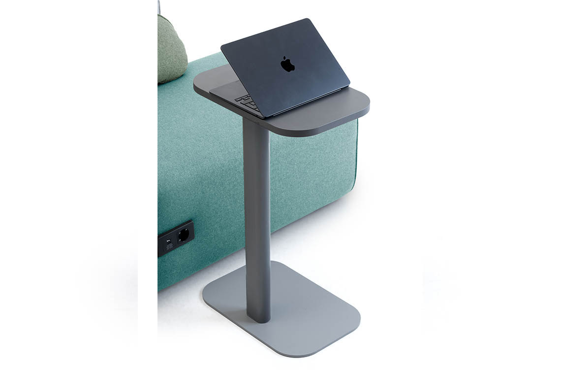 Noà Family coffee table designed to enrich waiting areas with a refined balance of functionality and contemporary aesthetics. The series includes a low, long centre table (306×600×1000 mm), perfect as a focal point for the space, and a side table (406×600×300 mm), ideal for placement on either side of a sofa or pouf, offering a practical surface without sacrificing visual lightness. Completing the collection, the freestanding C-shaped table (683×310×450 mm) stands out for its versatility: it can be positioned in front of the seat and partially slid underneath, creating a comfortable and stable support for laptops, notebooks, phones, or even a glass of wine. Its steel structure ensures sturdiness while maintaining an essential, minimalist look.
