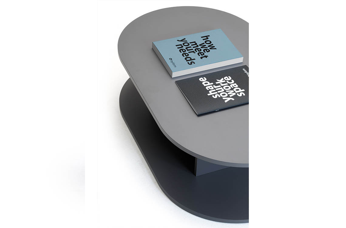 The low, long Noà table (306×600×1000 mm) is designed to be placed at the centre of the room and stands out for its oval shape, which gives it a soft, contemporary look. The tabletop, made of 18 mm thick anthracite black melamine-faced board, features a durable and uniform surface designed to ensure long-lasting performance and easy cleaning. Its compact height and elongated proportions make this low table an ideal central furnishing element, perfectly suited to waiting rooms, lounge areas, or modern residential environments.